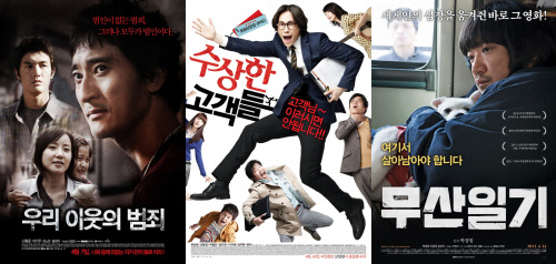 잔인한 계절 4월. 극장가에도 팍팍한 세상살이를 그린 영화들이 넘실댄다. '우리 이웃의 범죄', '수상한 고객들', '무산일기' 등 아득한 현실과 슬픈 사연을 담은 영화들이 연이어 관객과 만난다. 각기 다른 방식으로 현실을 고발하고 희망을 노래하는 세 편의 영화들. 그 면면은 이렇다.