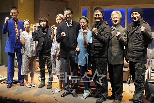 배우 홍승균, 심영은, 류덕환, 이채영, 장진 감독, 예지원, 정웅인, 김병옥, 조복래(왼쪽부터)가 15일 오후 서울 종로구 동숭아트센터 소극장에서 열린 연극 '서툰 사람들' 프레스콜에서 포토타임을 갖고 있다.