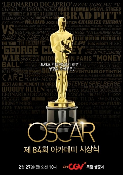 미국 최대 영화 시상식 제 84회 아카데미 시상식이 채널CGV를 통해 국내 안방 극장에 생중계된다.