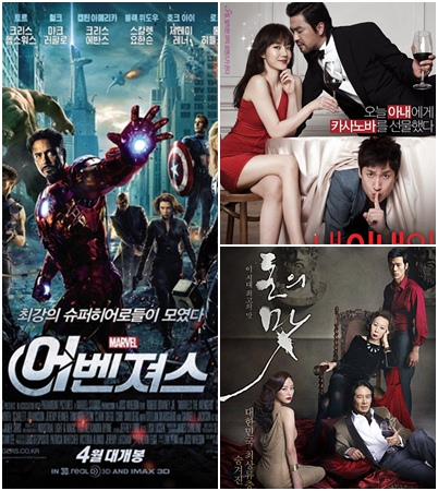 '어벤져스'는 지난 17일 '돈의 맛(감독 임상수)'과 '내 아내의 모든 것(감독 민규동)'이 개봉하며 일일 박스오피스 3위까지 물러났다. 17일에 이어 18일에도 두 영화에 밀려 3위에 머물렀다. 17일 5만 7268명, 18일 8만 7292명으로 이틀 간 부진한 성적을 보였던 '어벤져스'는 19일 25만 여명의 관객을 모으며 일일 박스오피스 1위를 탈환했다.