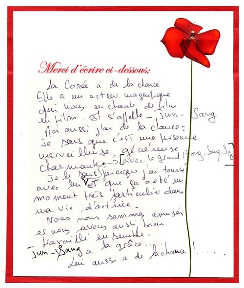 프랑스 배우 이자벨 위페르가 유준상의 책에 자필로 추천사를 전했다.