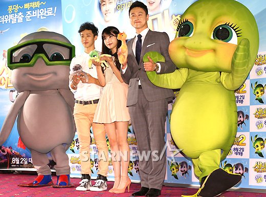 가수 이기광, 아이유, 개그맨 김원효가 26일 오후 서울 용산CGV에서 열린 애니메이션 '새미의 어드벤쳐2' 언론시사 및 기자간담회에서 포즈를 취하고 있다.