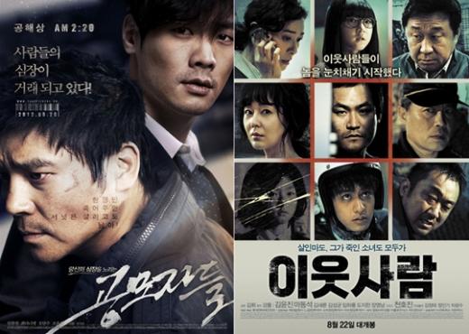 두 편의 핏빛 스릴러가 박스오피스를 이끌고 있다. '공모자들'(감독 김홍선)과 '이웃사람'(감독 김휘)이다. 섬뜩한 범죄 사건을 전면에 내세운 두 영화는 최근 이어지고 있는 강력범죄 뉴스들과 함께 보는 이들을 더욱 긴장시키고 있다.