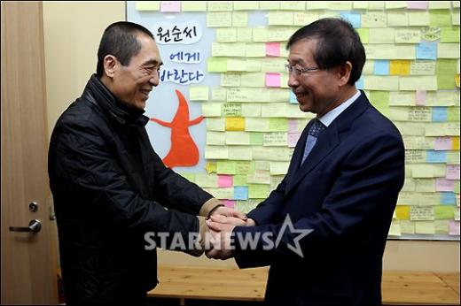 박원순 서울시장과 장예모 감독이 31일 오전 서울시청 집무실에서 '서울-북경 간 문화 교류 환담'을 나누기 위해 만나 악수를 하고 있다.