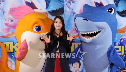 배우 남보라가 4일 오후 서울 왕십리 CGV에서 열린 애니메이션 '파이스토리: 악당상어 소탕작전' 언론시사회에 참석해 극중 캐릭터인 파이-트로이와 포즈를 취하고 있다.