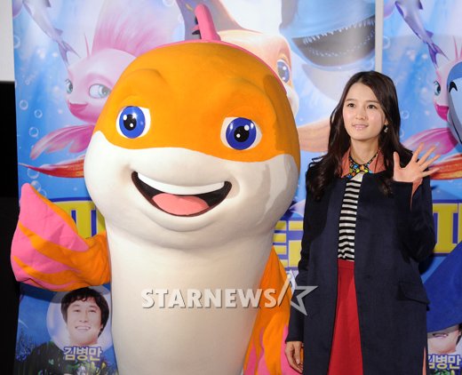 배우 남보라가 4일 오후 서울 왕십리 CGV에서 열린 애니메이션 '파이스토리: 악당상어 소탕작전' 언론시사회에 참석해 극중 캐릭터인 파이와 포즈를 취하고 있다.