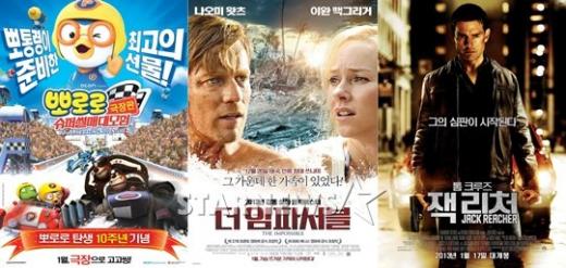 그러나 한 발 물러나 보면 의외의 복병들이 곳곳에 포진해 있다. 아이들의 대통령, 뽀로로를 극장에서 볼 수 있는 애니메이션 '뽀로로의 슈퍼썰매 대모험'(24일 개봉), 2004년 동남아시아를 덮친 쓰나미 참사를 다룬 색다른 재난 영화 '더 임파서블'(17일 개봉), 또 다시 한국행 비행기에 오른 톰 크루즈의 액션 스릴러 '잭 리처'(17일 개봉) 등이다.
