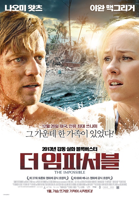 '더 임파서블'은 2004년 12월 26일 아시아를 덮친 초대형 쓰나미 속에서 살아남은 한 가족의 실화를 영화로 담은 작품이다. 이완 맥그리거, 나오미 왓츠, 톰 홀랜드 등이 출연했다.