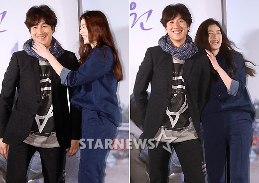 배우 정은채가 19일 오후 서울 왕십리CGV에서 열린 영화 '누구의 딸도 아닌 해원' 언론시사 및 간담회에서 동료 이선균에게 장난스러운 포즈를 취하고 있다.
