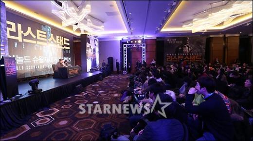 연예영화[★포토]'라스트스탠드' 열띤 취재열기발행 : 2013.02.20 ・ 11:47임성균 기자헐리웃배우 아놀드 스왈제네거와 김지운 감독이 20일 오전 서울 여의도 콘래드호텔에서 열린 영화 '라스트스탠드' 기자회견에 참석해 취재진의 질문에 답하고 있다.영화 '라스트 스탠드'는 슈퍼카를 타고 질주하는 마약왕과 그를 막아내야 하는 시골 보안관의 혈투를 그린 액션 영화로 오는 21일 개봉한다.<저작권자 © 스타뉴스, 무단전재 및 재배포 금지>라스트스탠드추천 기사임성균 기자기자홈좋아요 연예-영화의 인기 급상승 뉴스연예-영화의 최신 뉴스