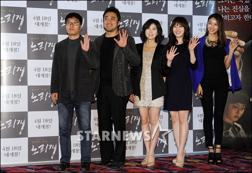 최승호 감독, 배우 마동석, 이승연, 민지현, 이도아(왼쪽부터)가 9일 오후 서울 강남구 삼성동 코엑스 메가박스에서 열린 영화 '노리개' 언론시사회에 참석해 포즈를 취하고 있다.