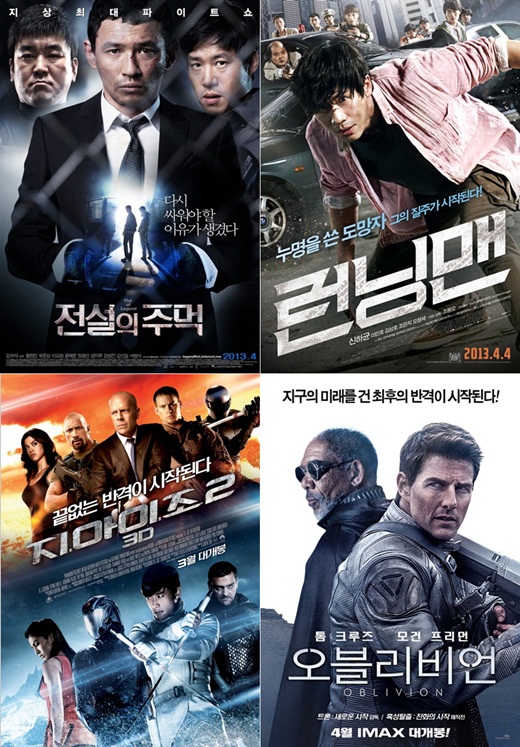 '전설의 주먹' '런닝맨' 등 한국영화들이 200만 명 이하의 관객을 모으며 부진한 성적을 거둔 것과 동시에 '오블리비언' '지.아이.조2' 등 할리우드 영화들이 선전한 것이 영향을 미쳤다. 여기에 지난 달 25일 개봉한 '아이언맨3'가 개봉 5일 만에 323만 관객을 동원한 것도 외국영화 점유율을 높이는데 일조했다.