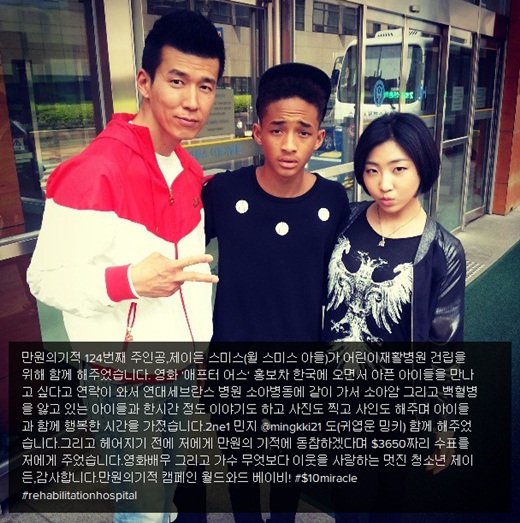 션은 이와 함께 "만원의 기적 124번 째 주인공, 제이든 스미스가 어린이재활병원 건립을 위해 함께 해주었다"는 글을 올렸다.