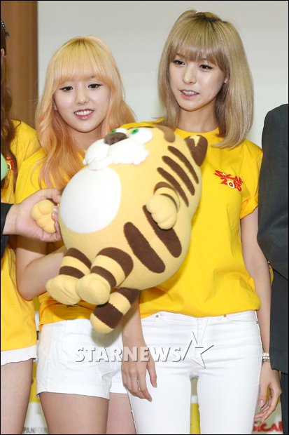 그룹 헬로비너스 윤조, 엘리스가 10일 오전 서울 중구 예장동 문학의 집 서울에서 열린 '제17회 서울국제만화애니메이션페스티벌(이하 SICAF2013)' 홍보대사 위촉식에 참석해 인형을 바라보고 있다.