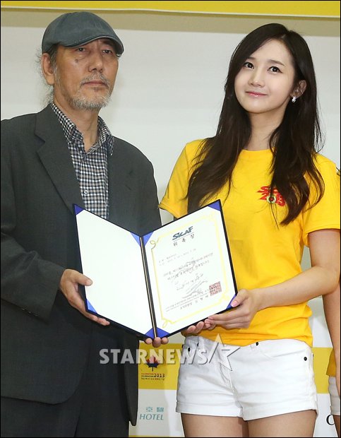 그룹 헬로비너스 유아라가 10일 오전 서울 중구 예장동 문학의 집 서울에서 열린 '제17회 서울국제만화애니메이션페스티벌(이하 SICAF2013)' 홍보대사 위촉식에 참석해 김형배 조직위원장과 기념촬영 하고 있다.