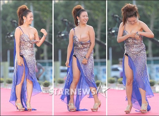 여민정은 드레스를 다시 끌어 올린 뒤 다시 레드카펫을 걸었다. 그러나 이내 드레스가 더욱 아래로 흘러내리며 가슴이 훤히 드러났다. 중요부위에 테이핑이 되어있었지만 민망한 순간이었다.