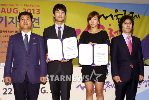 김영배 조직위원장, 배우 고주원, 이채원, 김종현 집행위원장(왼쪽부터)이 23일 오전 서울 중구 소공동 플라자호텔에서 열린 제15회 서울국제청소년영화제 공식기자회견에 참석해 홍보대사 위촉식을 마친 후 기념촬영 하고 있다.
