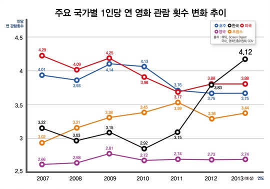 CJ CGV는 22일 영국의 미디어리서치업체 스크린 다이제스트의 자료를 바탕으로 올해 국내 관객의 1인당 평균 영화관람 편수가 미국을 제치고 처음으로 1위에 올라서게 된다고 밝혔다.