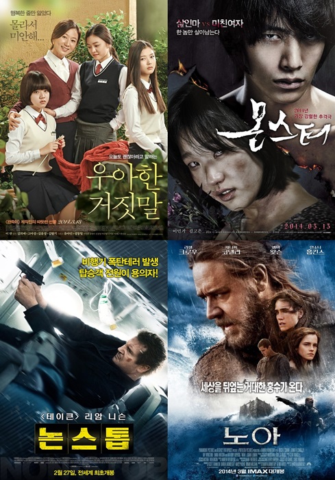 '우아한 거짓말', '몬스터' 등 여성 캐릭터들이 활약하는 한국 영화와 '논스톱' 등 남성미를 뽐내는 할리우드 영화가 극장가에서 경쟁하고 있다. 여기에 20일 개봉한 '노아'와 '노예 12년'도 가세했다.