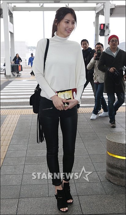 이날 수현의 공항 패션은 블랙 앤 화이트였다. 수현은 가죽 재질의 검은 색 하의에 같은 색의 오픈토 힐을 매치했다. 여기에 검은 색 미니 백으로 멋을 더했다. 아이보리빛 상의는 다소 심심할 수 있는 검은 색 일색의 의상에 포인트를 줬다.