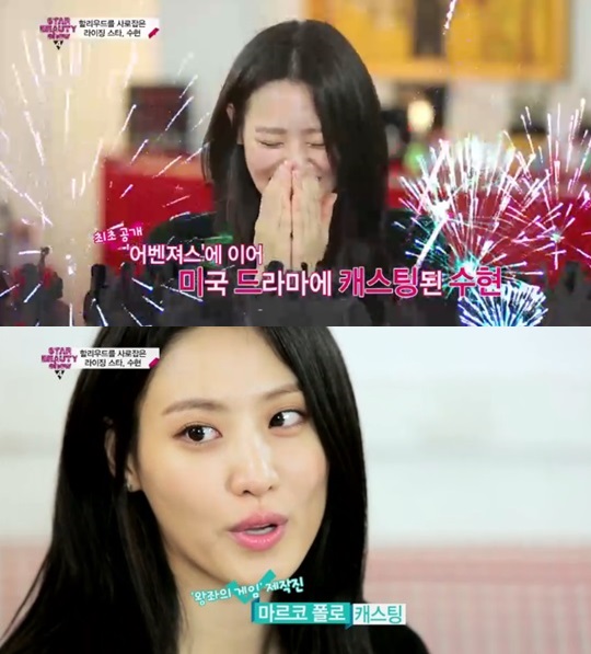 수현은 지난 24일 오후 방송된 케이블채널 SBS funE '스타뷰티쇼 시즌4'에 출연해 '어벤져스: 에이지 오브 울트론' 촬영 뒷이야기와 새 드라마 캐스팅 소식을 밝혔다.