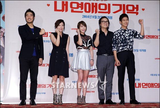 이권 감독, 배우 박그리나, 강예원, 송새벽, 김현준(왼쪽부터)이 6일 오후 서울 광진구 자양동 롯데시네마 건대입구점에서 열린 영화 '내 연애의 기억' 언론시사회에 참석해 포즈를 취하고 있다.