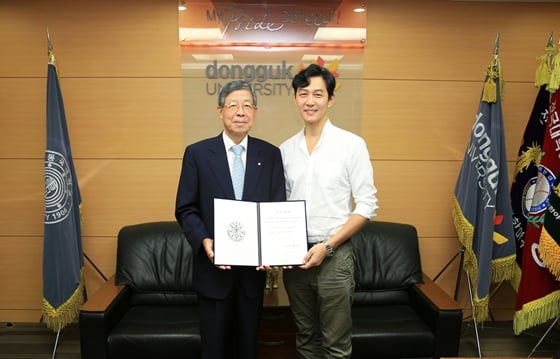 동국대 연극학부 99학번인 이정재는 25일 오전 11시 동국대 본관 총장 접견실에서 김희옥 총장을 만나 장학기금 1억 원을 전달했다.