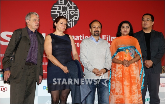 자크 랑시에르 심사위원, 디나 이오르다노바 심사위원, 아스가르 파르하디 심사위원장, 수하시니 마니라트남 심사위원, 봉준호 감독(왼쪽부터)이 3일 오전 부산광역시 해운대구 월석아트홀에서 열린 제19회 부산국제영화제 뉴 커런츠 심사위원 기자회견에 참석하고 있다.