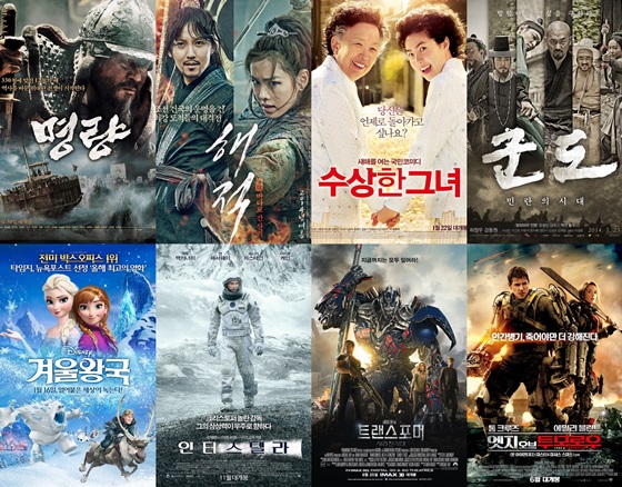 '명량'과 '해적' '군도'는 극장 최성수기인 7~8월 흥행작이며, '수상한 그녀'는 설 연휴 흥행작이다. 성수기 외에는 흥행에 성공을 거둔 영화가 없을 뿐더러 중급 흥행규모 영화가 없단 뜻이다. 10위권 밖으로는 추석 시즌에 개봉한 '타짜: 신의 손'(401만명), 5월 연휴를 겨냥했던 '역린'(384만명) 등이 있다.
