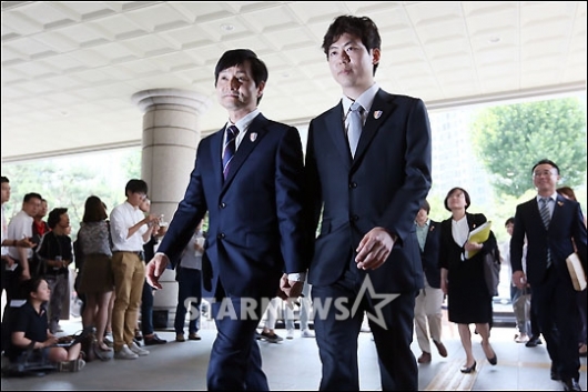 두 사람은 간단한 소감을 마친 후 포토타임에서도 손을 놓지 않았다. 또 환한 웃음을 지으며 담담하게 재판을 준비하는 모습을 보였다.