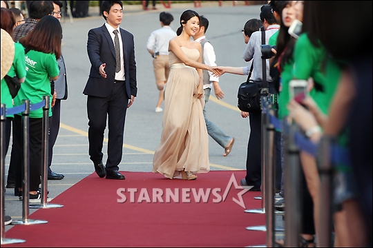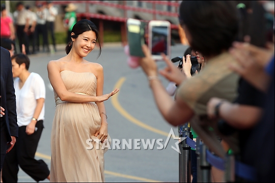 임신 8개월 차 배우 이윤지가 13일 오후 충북 제천시 청풍호반무대에서 열린 제11회 제천국제음악영화제 개막식에 참석하고 있다.
