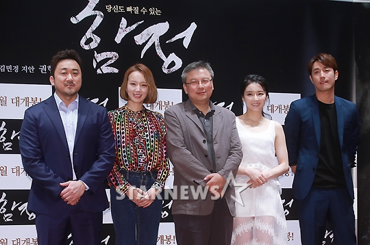 마동석, 김민경, 권형진 감독, 지안, 조한선(왼쪽부터)이 26일 오전 서울 광진구 자양동 롯데시네마 건대입구에서 열린 영화 '함정' 언론시사회에 참석해 포즈를 취하고 있다.