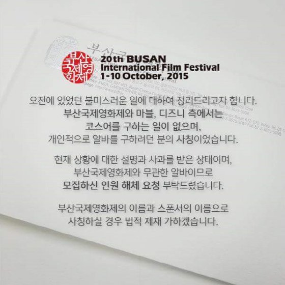 6일 부산영화제 측은 공식 SNS를 통해 "부산영화제와 마블, 디즈니 측에서는 코스어(코스프레를 하는 사람)를 구하는 일이 없으며 알바를 구하려던 사람의 사칭이었다"고 밝혔다.