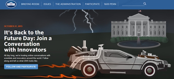 오바마 대통령과 함께 백악관도 '백 투 더 퓨처 데이' 기념행사에 동참했다. 백악관은 이날 공식 홈페이지 메인 화면에 영화 속 타임머신을 떠올리는 자동차 이미지와 '오늘은 백투더퓨처 데이'라는 축하 문구를 띄우며 축하했다.