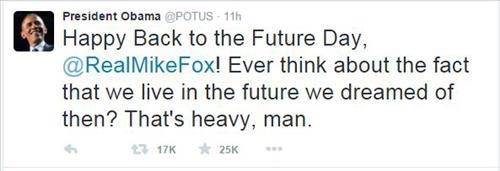 오바마 대통령은 21일(현지 시간) 트위터에 "즐거운 백 투 더 퓨처 데이!"라며 "영화에서 꿈꿨던 미래를 우리가 살고 있었을지 생각이나 할 수 있었을까?"라며 '백 투 더 퓨처 데이'를 축하하는 글을 남겼다.