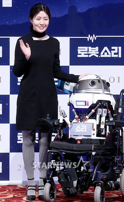 배우 심은경이 13일 오후 서울 자양동 롯데시네마 건대입구점에서 열린 영화 '로봇,소리' 언론시사 및 간담회에서 더빙을 맡은 로봇과 포즈를 취하고 있다.