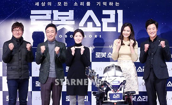 13일 오후 서울 자양동 롯데시네마 건대입구점에서 열린 영화 '로봇,소리' 언론시사 및 간담회에 참석한 감독 및 배우들이 파이팅을 외치고 있다.