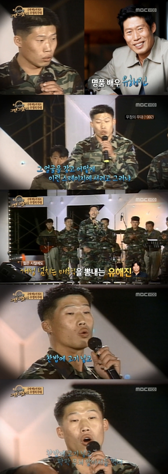 가장 시선을 집중시킨 것은 명품 배우 유해진(46). 1992년 당시 20대 초반이었던 군장병 유해진은 '우정의 무대' 무대에 올라 장기 자랑에 참여했다.