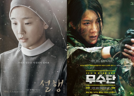 ○…박소담, 이지아가 주연을 맡은 두 영화도 나란히 극장가에 첫 선을 보인다. 박소담은 '설행_눈길을 걷다'로, 이지아는 '무수단'으로 각각 수녀복과 군복을 입고 극의 중심에 섰다. 전작 '검은 사제들'에서 악령에 사로잡힌 소녀로 열연한 박소담은 하얀 눈발을 배경으로 뽀얀 피부를 지닌 수녀로 돌아온다. 여기에 터프한 캐릭터도 마다하지 않았던 이지아가 '무수단'을 통해 엘리트 장교로 거듭나는 모습도 볼만할 것 같다.