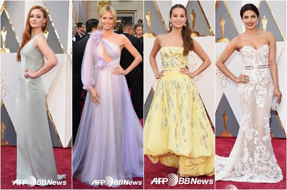 여우주연상 후보인 '브루클린'의 시얼샤 로넌은 짙은 그린 드레스로 성숙미를 풍겼고, 여우조연상 후보인 '데니쉬 걸'의 알리시아 비칸데르는 봄 분위기가 물씬 나는 노란 드레스를 선택했다.