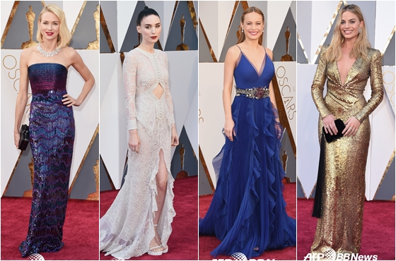 이날의 레드카펫은 허리를 드러내는 우아한 롱 드레스가 대세. 여우주연상 1순위 후보인 '룸'의 브리 라슨은 가느다란 어깨끈이 달린 블루 드레스를 입었고, 섹시 미녀스타 마고 로비는 머리색과 어울리는 황금색 드레스로 고급스러운 느낌을 냈다.