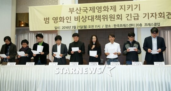 지난 달 21일 오전 서울 중구 한국프레스센터에서 열린 '부산국제영화제 지키기, 범 영화인 비상대책위원회 긴급 기자회견'에서 참석자들이 성명서를 낭독하고 있다. / 사진=스타뉴스