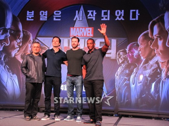 이날 기자회견에는 조 루소 감독과 캡틴 아메리카 역의 크리스 에반스, 윈터솔져 역의 세바스찬 스탠, 팔콘 역의 안소니 마키가 참석했습니다. 캡틴 아메리카 팀이죠. 로버트 다우니 주니어 등 아이언맨 팀은 유럽에서 홍보를 진행합니다.