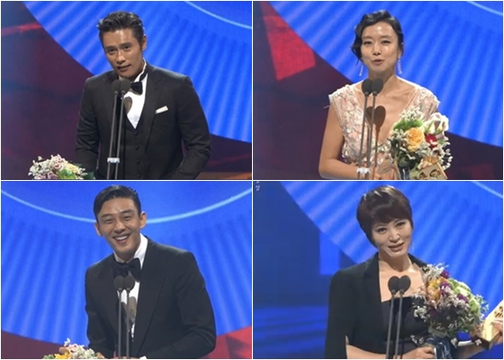 '내부자들'의 이병헌은 영화 부문 남자 최우수연기상을 수상하며 건재함을 알렸다. 몰락한 정치깡패 안상구로 분해 청불영화 최고 흥행을 이끌었던 그는 호흡을 맞춘 백윤식과 조승우, 가족을 향해 고마움을 전해 눈길을 모았다. 영화 부문 여자 최우수연기상은 '무뢰한'의 전도연이 받았다. 살인자 남자친구를 위해 희생을 마다하는 여인 김혜경 역을 맡은 그는 "앞으로 계속계속계속 좋은 배우로 거듭나고 싶다"며 늘 엄마를 기다려준 딸에게 고맙다는 소감을 밝혔다.