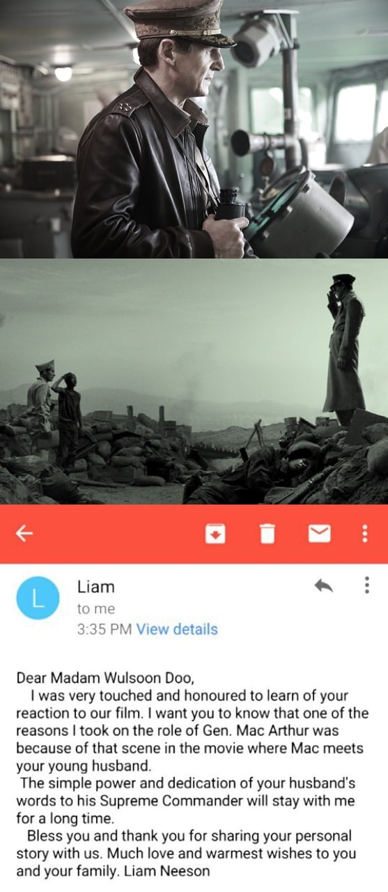 리암 니슨은 "두뤟순 여사님, 영화를 보고 느낀 소감에 대해 전해 들었습니다. 정말 영광이고 큰 감동을 받았습니다. 제가 이 영화에 출연하기로 결심하게 된 계기는 영화에 나오는 장면인 여사님의 남편께서 맥아더 장군을 만나 대화를 나누는 부분 때문이었습니다. 맥아더 장군께 이야기 한 간결하지만 힘 있는 남편 분의 한 마디는 제 가슴 속에 오래오래 남아있을 것입니다. 여사님의 이야기를 들려주셔서 정말 감사합니다. 여사님과 가족 모두에게 깊은 감사의 말씀을 드립니다"라며 감사의 인사를 전했다. 이처럼 실제 참전용사의 가족에게 감사의 인사를 전하며 '인천상륙작전'에 대한 꾸준한 관심을 보이고 있는 맥아더 장군 역의 리암 니슨은 작전을 진두지휘하는 수장의 위엄 있는 카리스마와 묵직한 존재감으로 극에 무게감을 더하며 관객들의 뜨거운 반응을 얻고 있다.