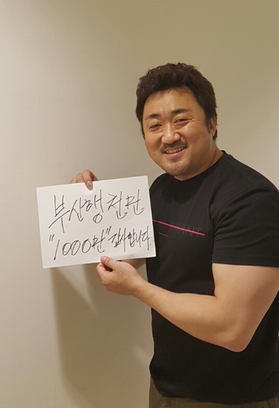 마동석은 "'부산행'이 많은 사랑을 받아 진심으로 기쁘고 천만 관객 분들게 감사드린다"며 "기차모형 세트장에서 무더위와 다투며 촬영한 장면들이 파노라마처럼 지나간다"고 털어놨다.