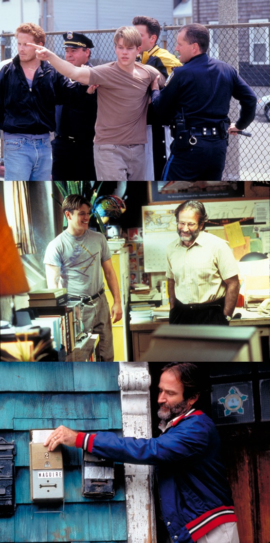 가장 먼저 시선을 사로잡는 첫 번째 스틸에는 경찰들과 실랑이를 벌이고 있는 윌의 반항적인 모습이 그대로 담겨 있어 그가 어떤 상처를 가지고 있는지 사연에 대한 궁금증을 불러일으킨다. 이어 촬영 현장에서의 맷 데이먼은 반항기 넘치는 윌과는 정반대로 화사하게 웃는 모습으로 20대 리즈시절을 보여주고 있다.