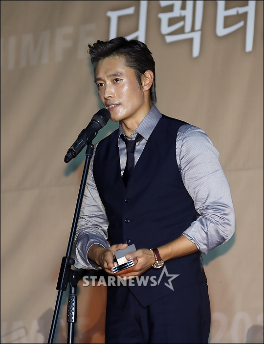 배우 이병헌이 12일 오후 충북 제천시 청풍리조트 레이크호텔에서 열린 '2016 디렉터스 컷 어워즈'에서 남자 연기자상을 수상하고 소감을 말하고 있다.