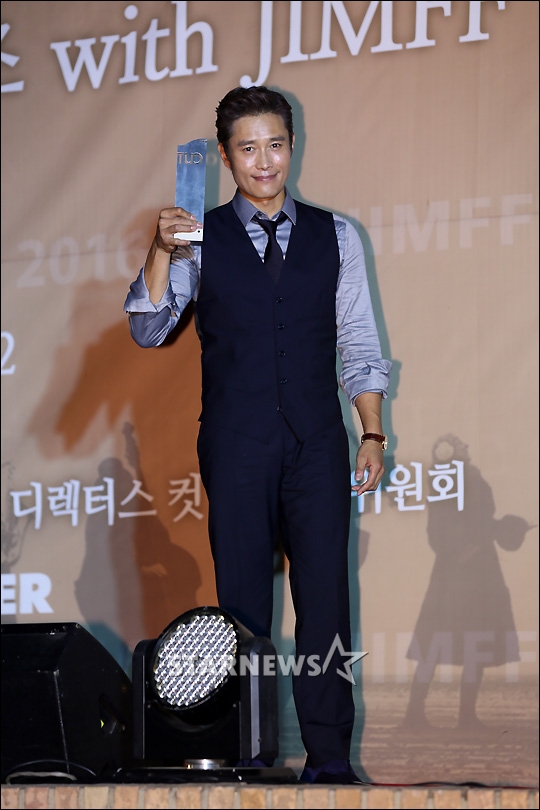 배우 이병헌이 12일 오후 충북 제천시 청풍리조트 레이크호텔에서 열린 '2016 디렉터스 컷 어워즈'에서 남자 연기자상을 수상하고 소감을 말하고 있다.
