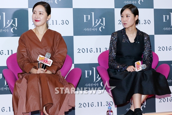 배우 엄지원, 공효진이 17일 오후 서울 강남구 코엑스 메가박스에서 진행된 영화 '미씽:사라진 여자 (감독 이언희)' '수고했어 오늘도' 쇼케이스에 참석해 인터뷰를 하고 있다.